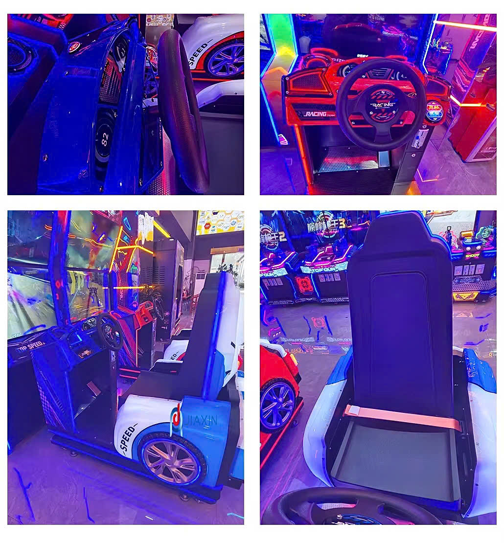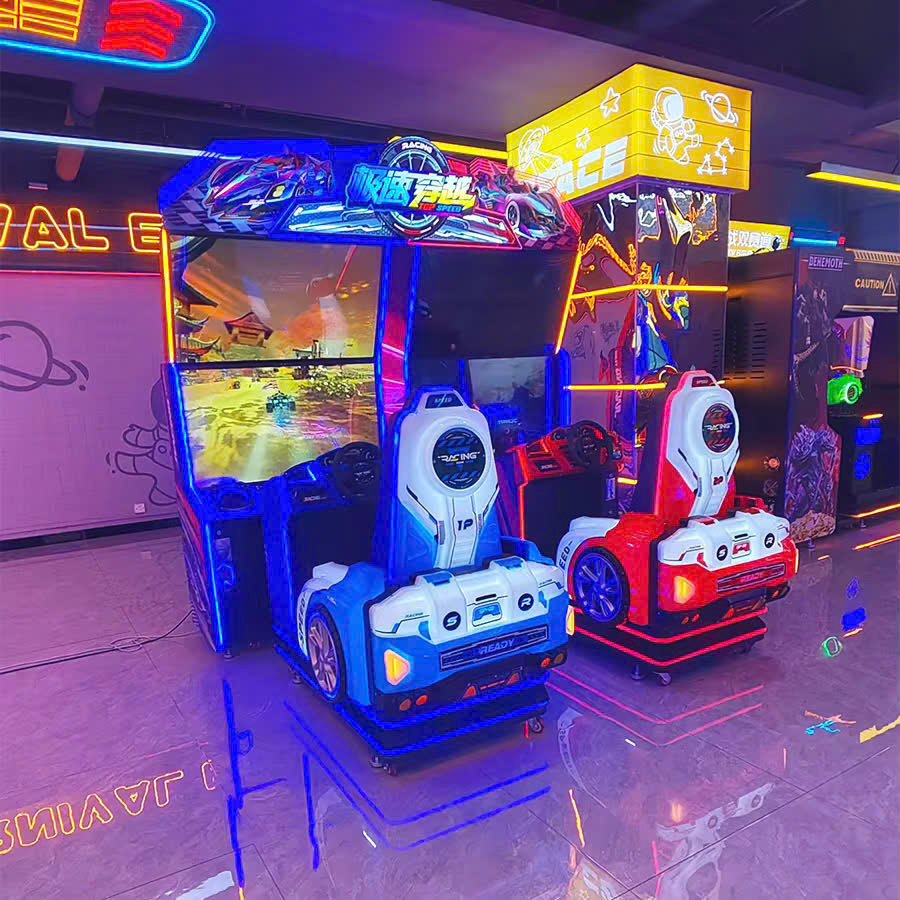 Máy game đua xe hơi 2 người cực tốc với ghế ngồi mô phỏng và màn hình lớn trong phòng arcade đèn LED
