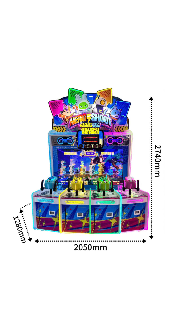 • Tăng doanh thu trên mỗi mét vuông: Kích thước máy H2740 x W2050 x D1280 mm – chiếm diện tích vừa phải nhưng thu hút đông người chơi nhờ chế độ 4 người cùng lúc. Trung bình mỗi giờ có thể quay vòng 20‑30 lượt (tùy khung giờ).