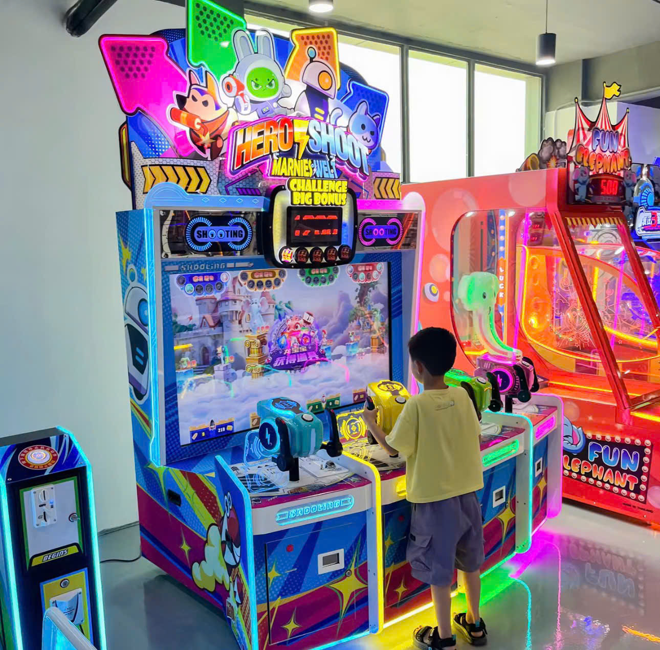Trẻ em đang trải nghiệm chơi máy bắn súng Hero Shoot.