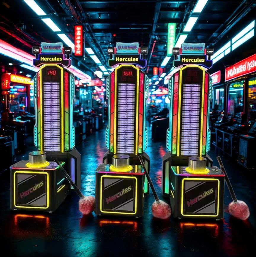 Máy game đập búa đo sức mạnh Hercules gây ấn tượng bằng ánh sáng LED sặc sỡ, giao diện hấp dẫn và tính tương tác cao. Người chơi dễ bị “đánh trúng” cảm giác mạnh và cạnh tranh điểm số, đóng vai trò như một điểm nhấn cho bất kỳ khu vui chơi hay trung tâm giải trí nào.