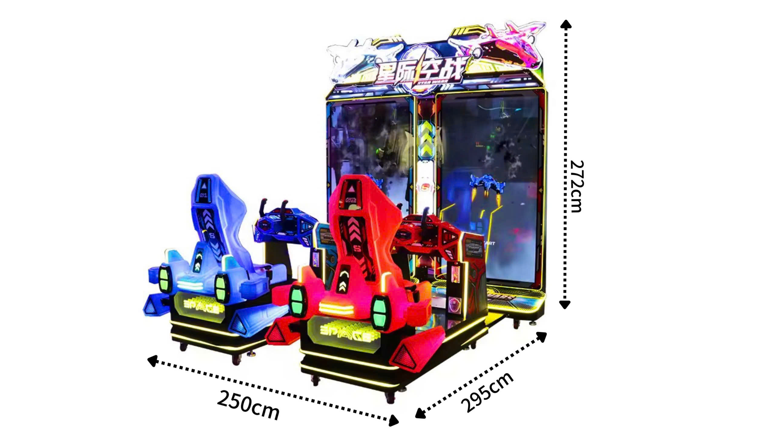Theo thông số từ nhà sản xuất, máy có kích thước tổng thể lên tới 250cm (Rộng) * 295cm (Sâu) * 272cm (Cao). Đây được xem là một “cỗ máy” kích thước lớn, tạo ra sức hút cực mạnh về mặt thị giác ngay từ lối vào khu vui chơi. Với công suất hoạt động 2100W, máy đảm bảo hiệu năng đồ họa mượt mà và hệ thống rung lắc chân thực.