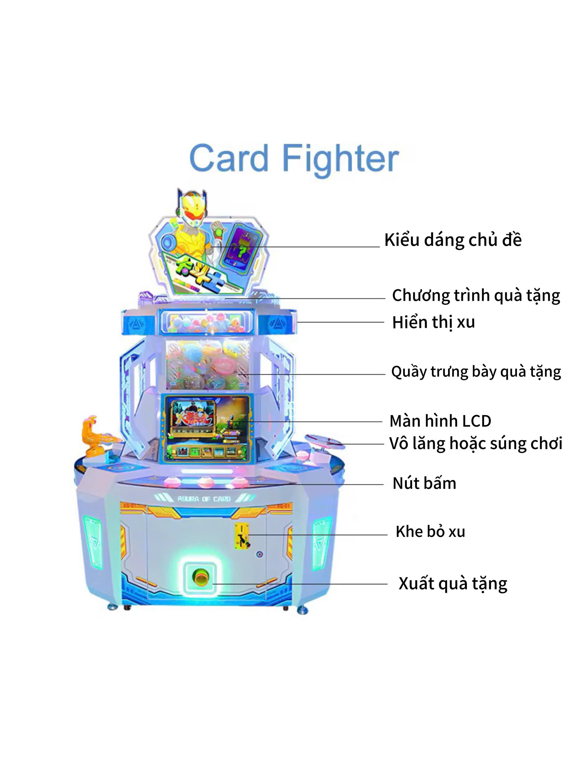 Cấu tạo và các bộ phận của máy game Card Fighter, màn hình LCD, vô lăng/súng chơi, khay xuất quà tặng
